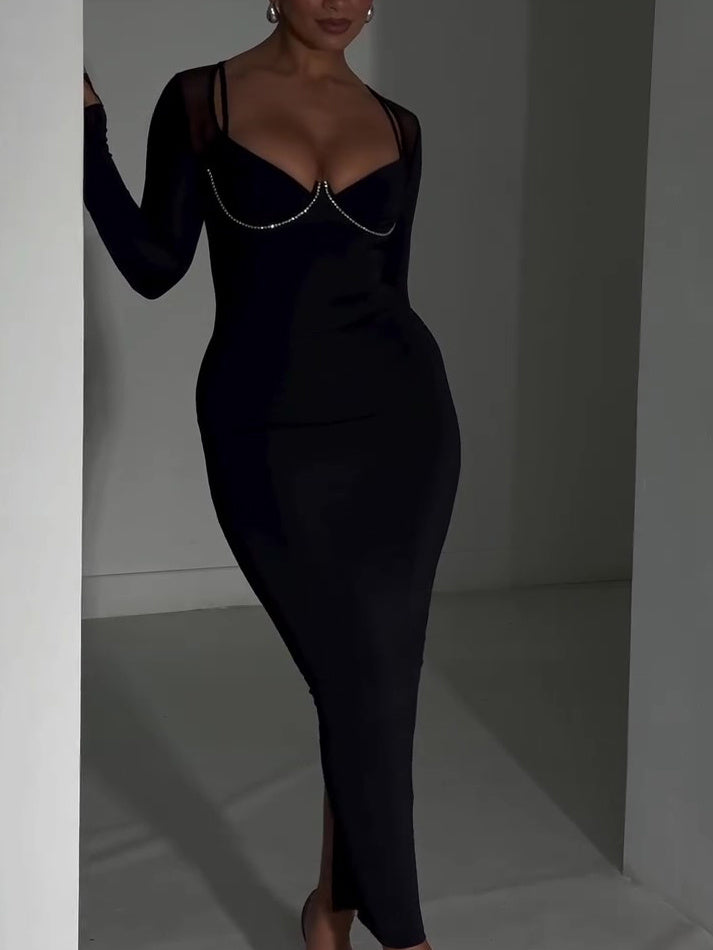 Black Bodycon Midi Dress – Rhinestone Chain Party Dress with Mesh Sleeves